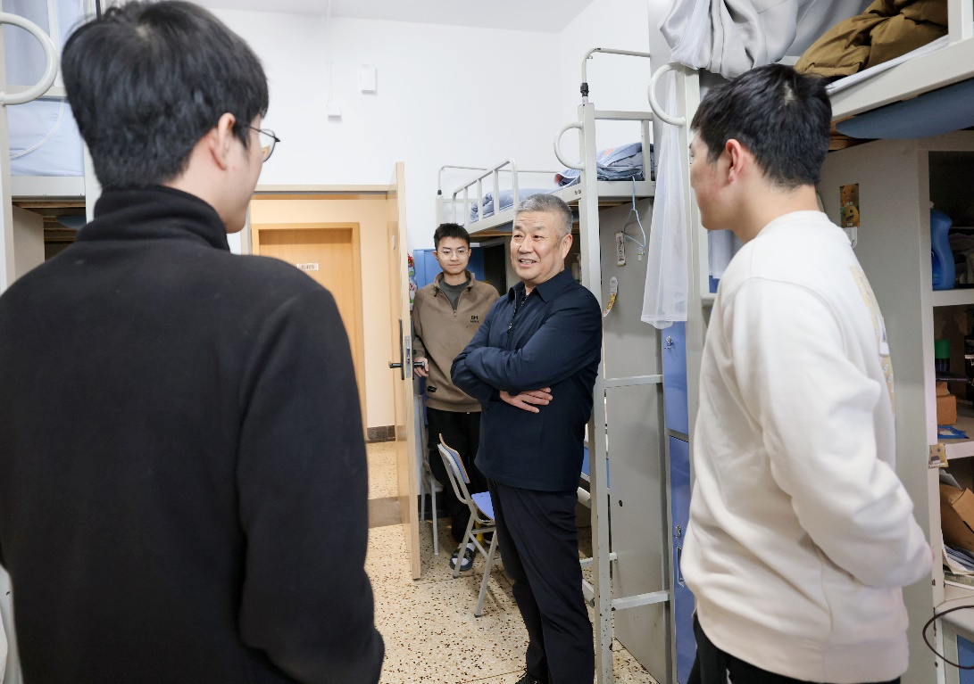 “你的家乡是哪里的”“学习生活中有什么压力、困难”“平时有什么兴趣爱好”“计划跟哪位老师读研究生”,每到一间宿舍,赵长禄都与同学们亲切交谈,细致询问大家的学习生活情况。随着话题的深入,同学们也由一开始的拘束慢慢变得熟络起来,热情地交流想法、吐露心声。赵长禄说到,学校始终致力为学生提供一流的学习生活条件,希望同学们都能实现真才实学引领下的德智体美劳全面发展。结合自身经历和所见所感,赵长禄叮嘱同学们,“平时要加强体育锻炼,融入学校体育文化,掌握一项体育技能,养成一生运动习惯,在运动中强健体魄、锤炼意志”“要从整理内务的小事做起,培养自律的生活习惯,以良好的精神面貌开启一天的学习生活”。
