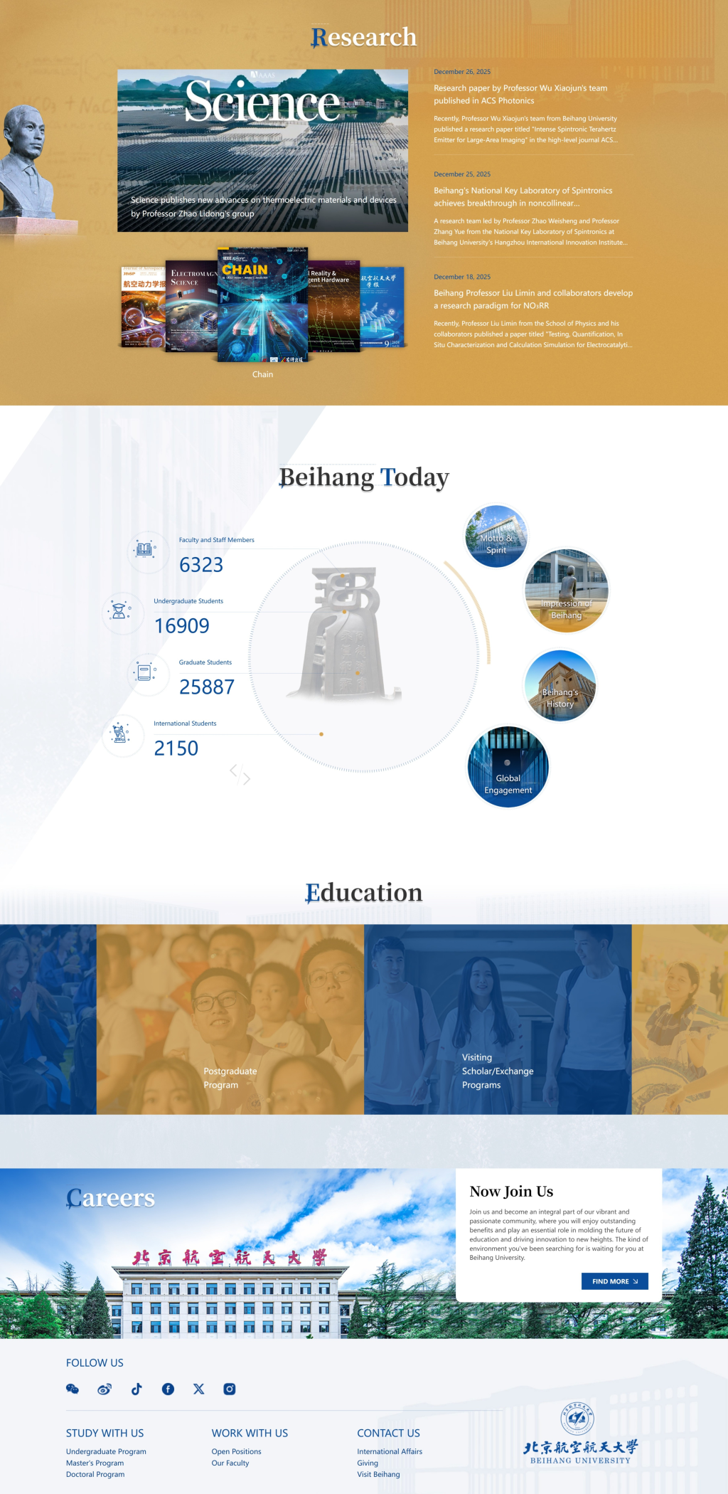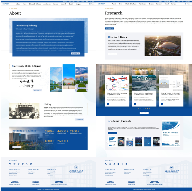 网站视觉上以北航标志性蓝色为主调,搭配学术金、银灰色系,营造沉稳而富有活力的色彩氛围。页面设计中巧妙融入校园代表建筑、人文雕塑、海棠花、飞机及学术符号等元素,形成独特视觉语言。交互设计注重流畅性与简洁性,通过精炼的动效提升浏览质感,打造开放、包容、专业的国际化形象。