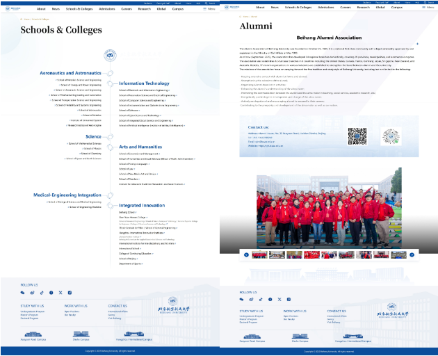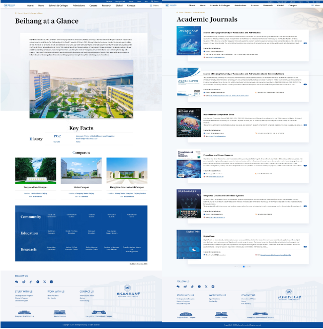 内容上,新版官网以用户需求为中心,设置了“About(关于北航)”、“News(新闻动态)”、“Schools & Colleges(学院设置)”、“Admissions(招生信息)”、“Careers(人才招聘)”、“Research(科学研究)”、“Global(国际合作)”及“Campus(校园生活)”8个一级栏目,下设90余个二、三级页面,体系清晰,覆盖全面。一级栏目均设有综合引导页,帮助用户快速定位所需信息。