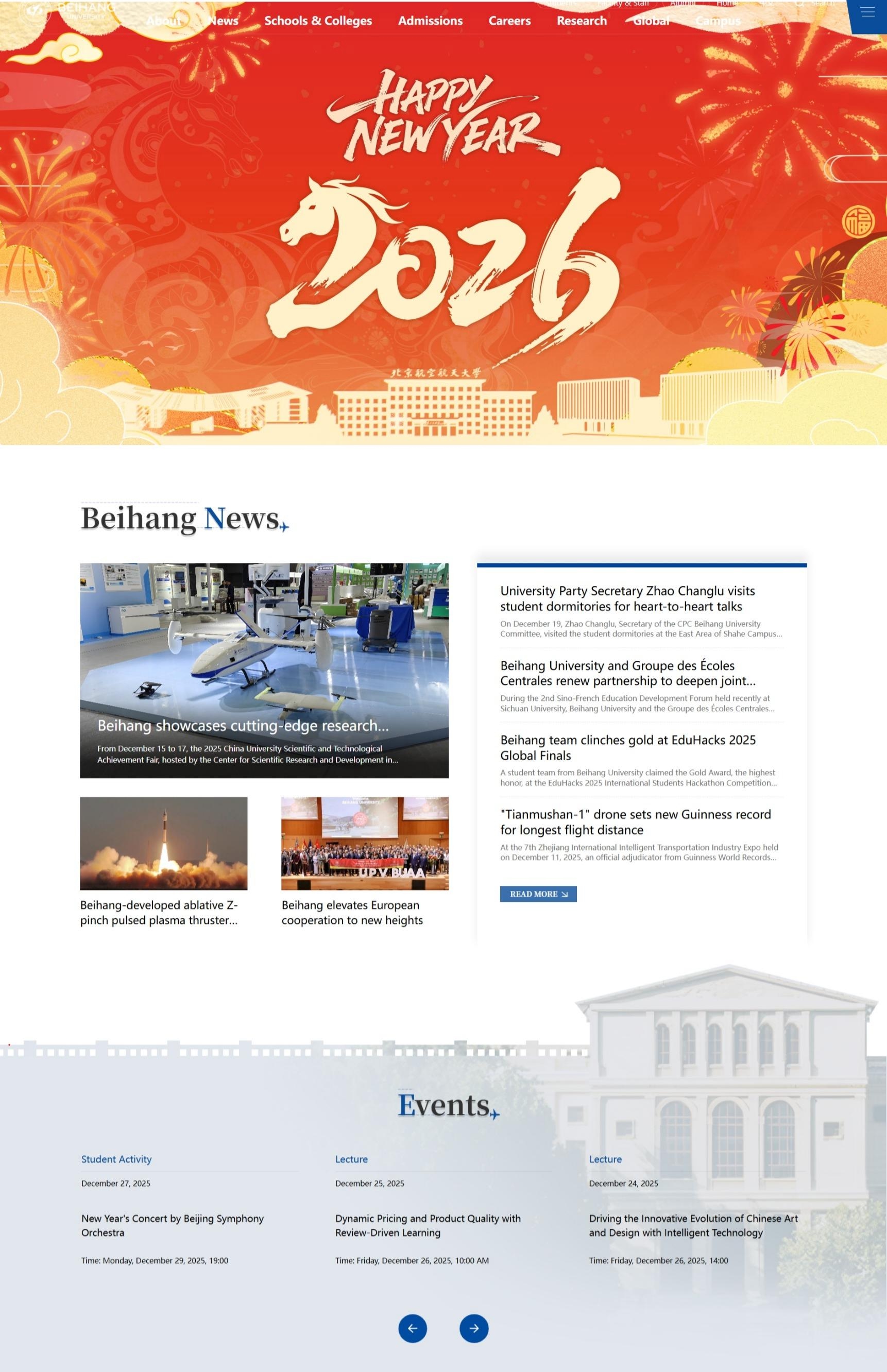 北航新闻网1月1日电(记者 吕星芸)2026年1月1日,北京航空航天大学新版英文官网正式上线。新版英文官网以全新的面貌彰显着新年新气象,融合“国际简约、人文科技”的设计理念,以北航标志性蓝色为主调,整体风格呈现开放、包容、专业的国际化学府气象,旨在为全球用户提供更高效、优质的信息服务,提升学校国际声誉和影响力。