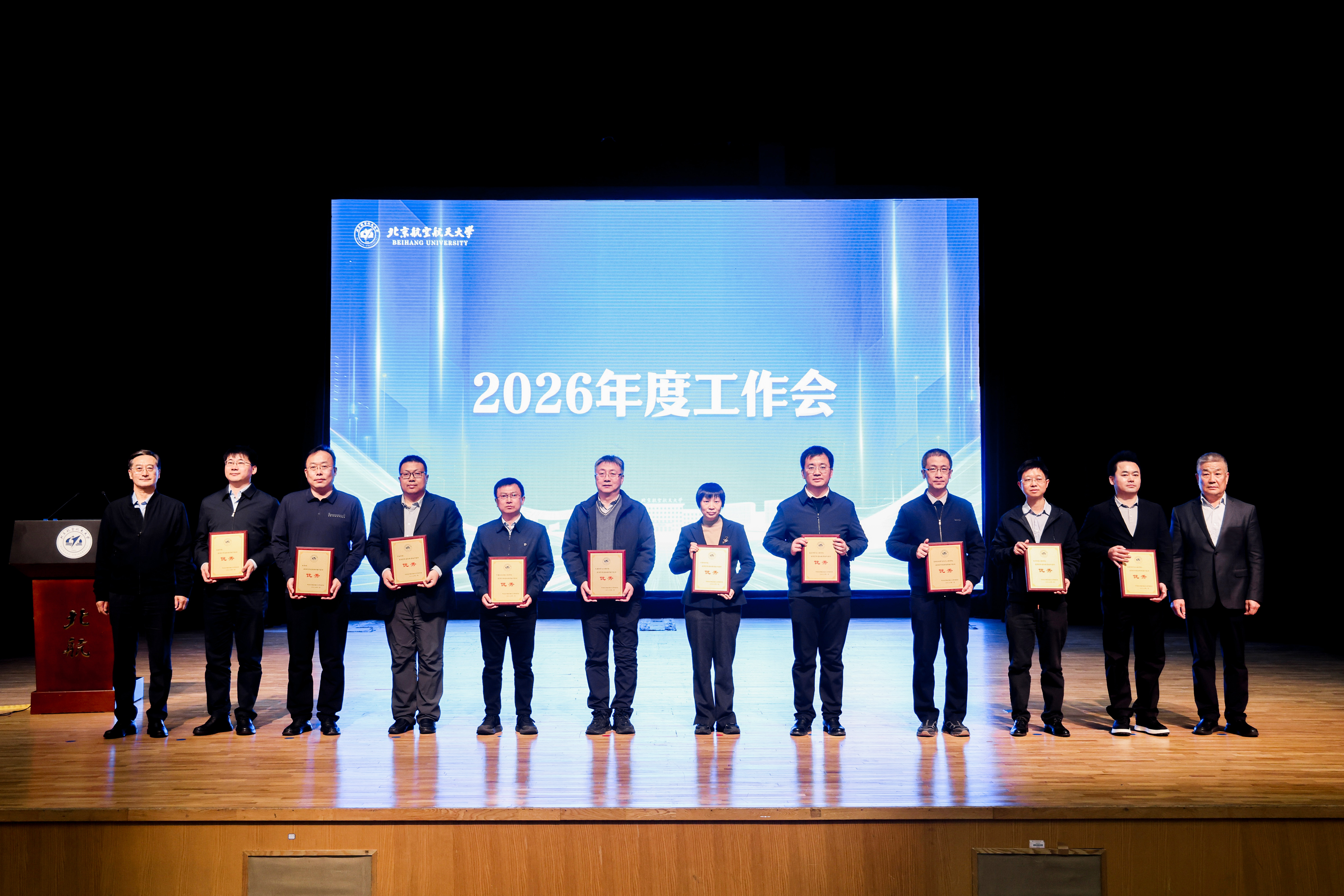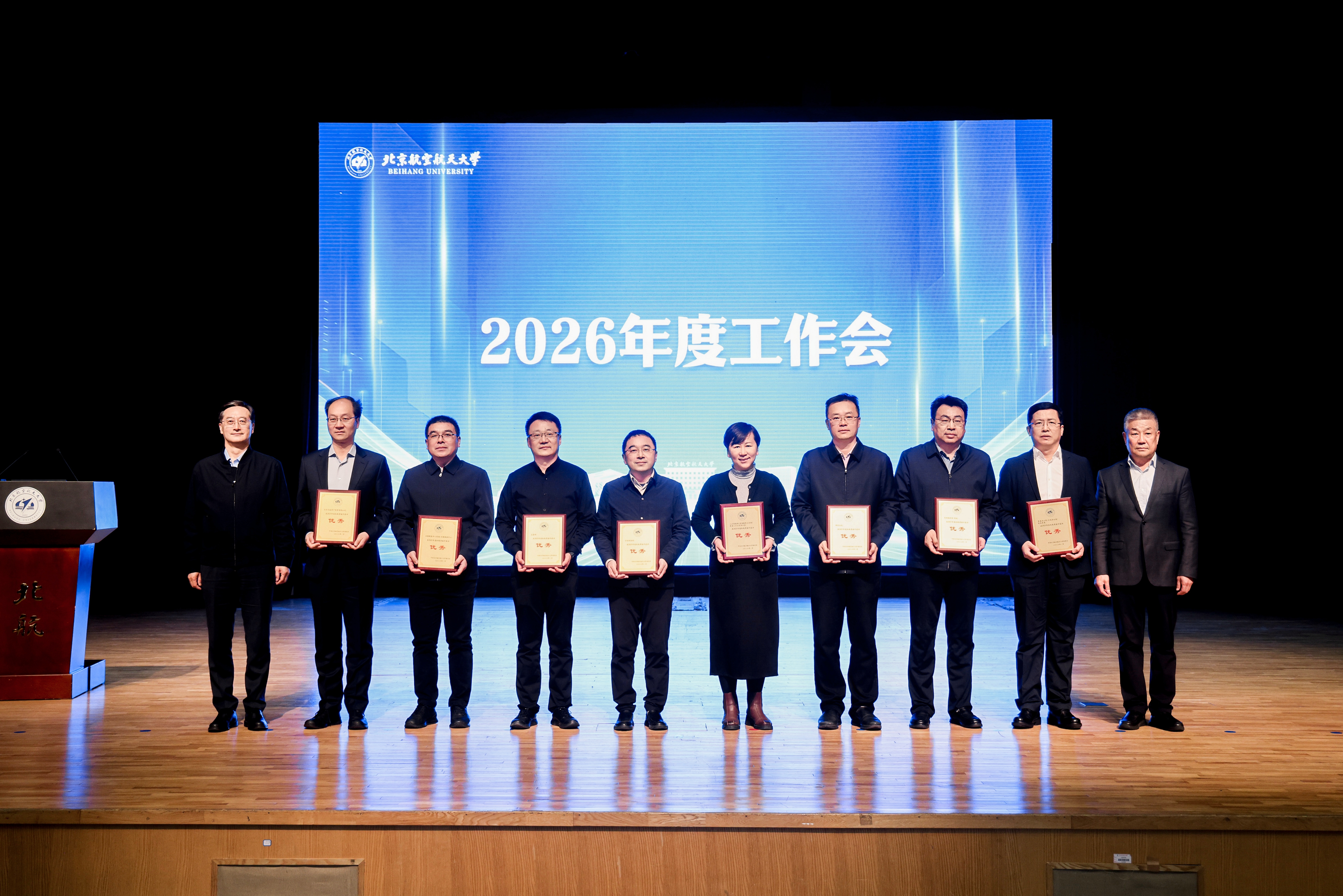 会上还表彰了2025年度机构考核优秀单位,材料科学与工程学院、电子信息工程学院、自动化科学与电气工程学院、航空科学与工程学院、计算机学院、交通科学与工程学院、可靠性与系统工程学院、宇航学院、体育部、北航学院,党政办公室、党委组织部、研究生院、人力资源部、计划财务部、总务部、后勤服务中心、北京北航资产经营有限公司获2025年度机构考核优秀单位。党委书记赵长禄、校长王云鹏为考核优秀单位颁发奖牌。